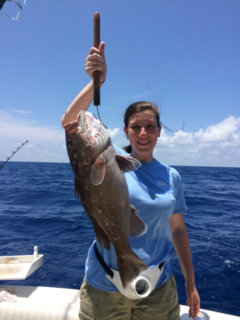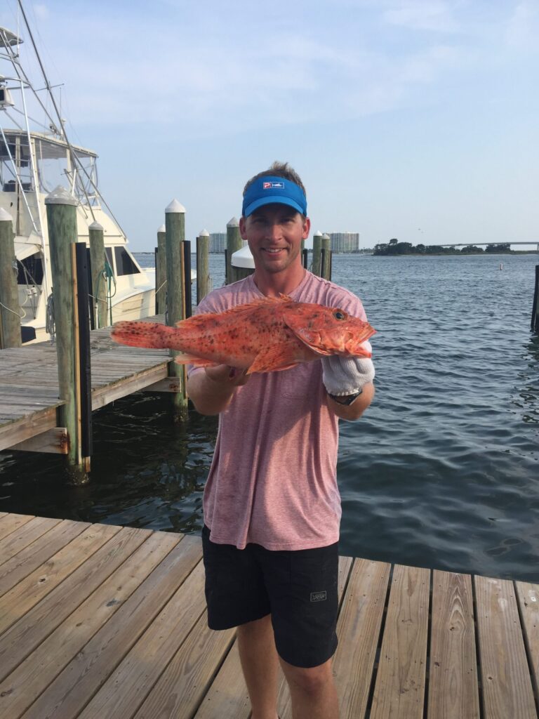 Scamp grouper are known for their broom tail shape. These fish are excellent tasting. You will find them on hard bottom and small live bait or whole squid are good options for catching these grouper. The weight can range from 4 pounds to over 10 pounds. A 20 pound scamp is rare in our area but we do see them.