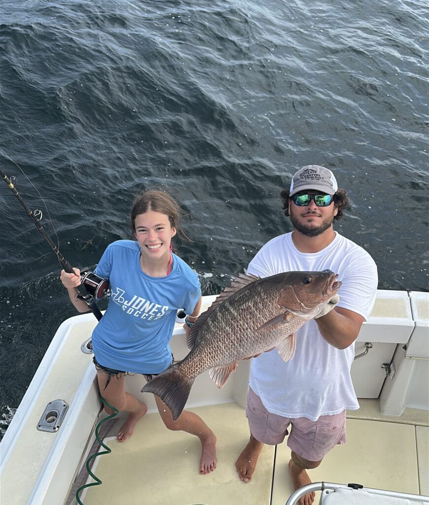 We do not see very many black snappers but it is always exciting to catch one. These fish are sometimes caught by chumming small cut bait and enticing these fish to swim to the surface. You may then use light spinning tackle with a small piece of bait on a small hook. These fish are very cautious so be patient. We see many fish in the 2-4 pound range but sometimes catch one near 10 pounds. These fish are also caught on the bottom with large baits.